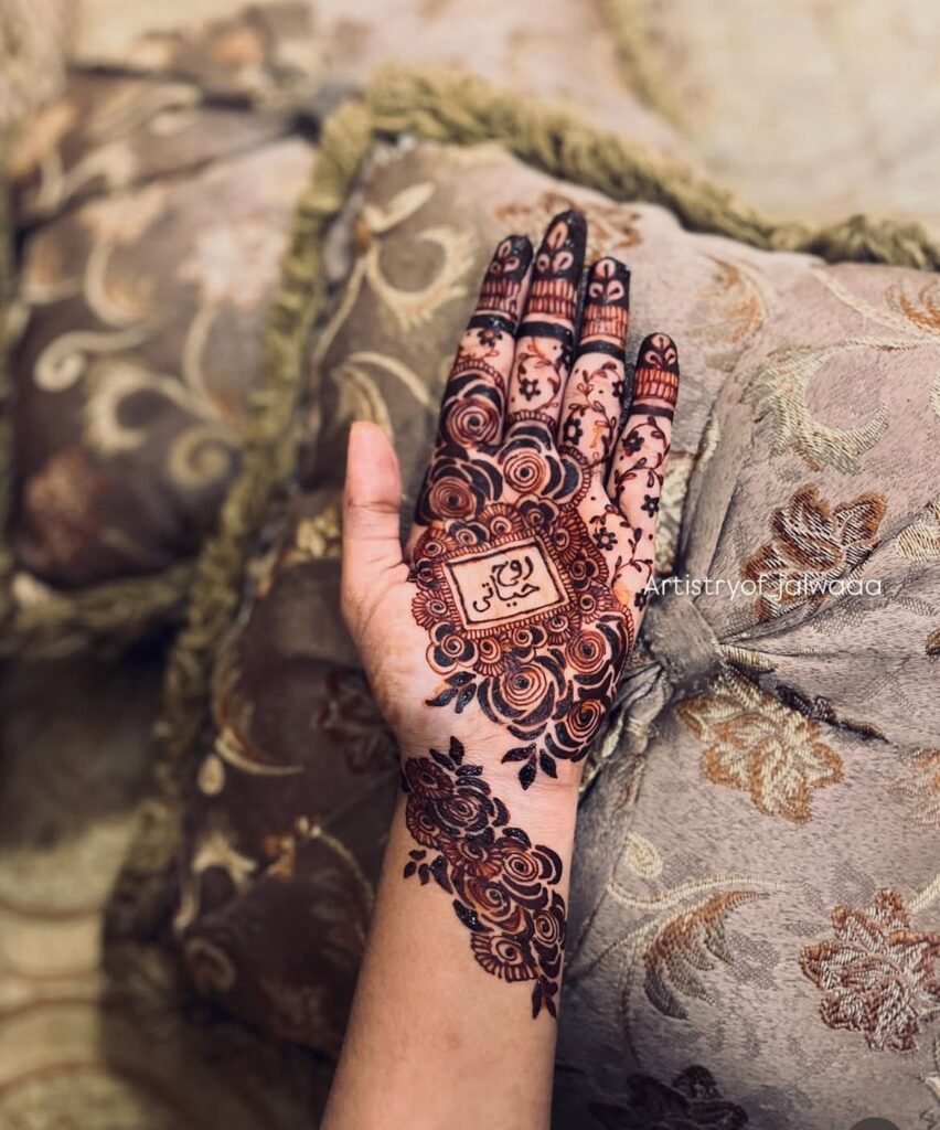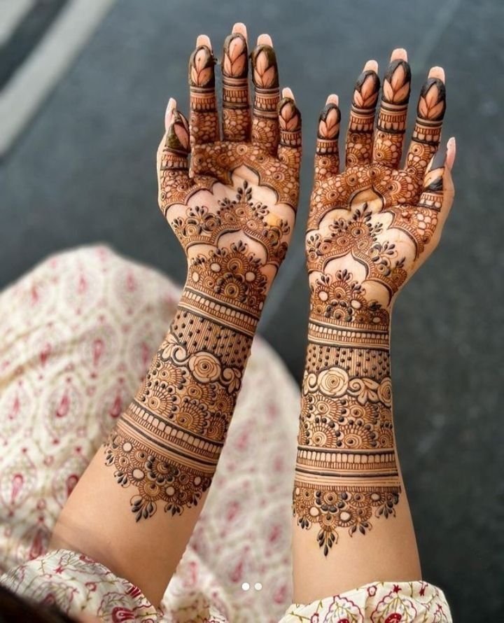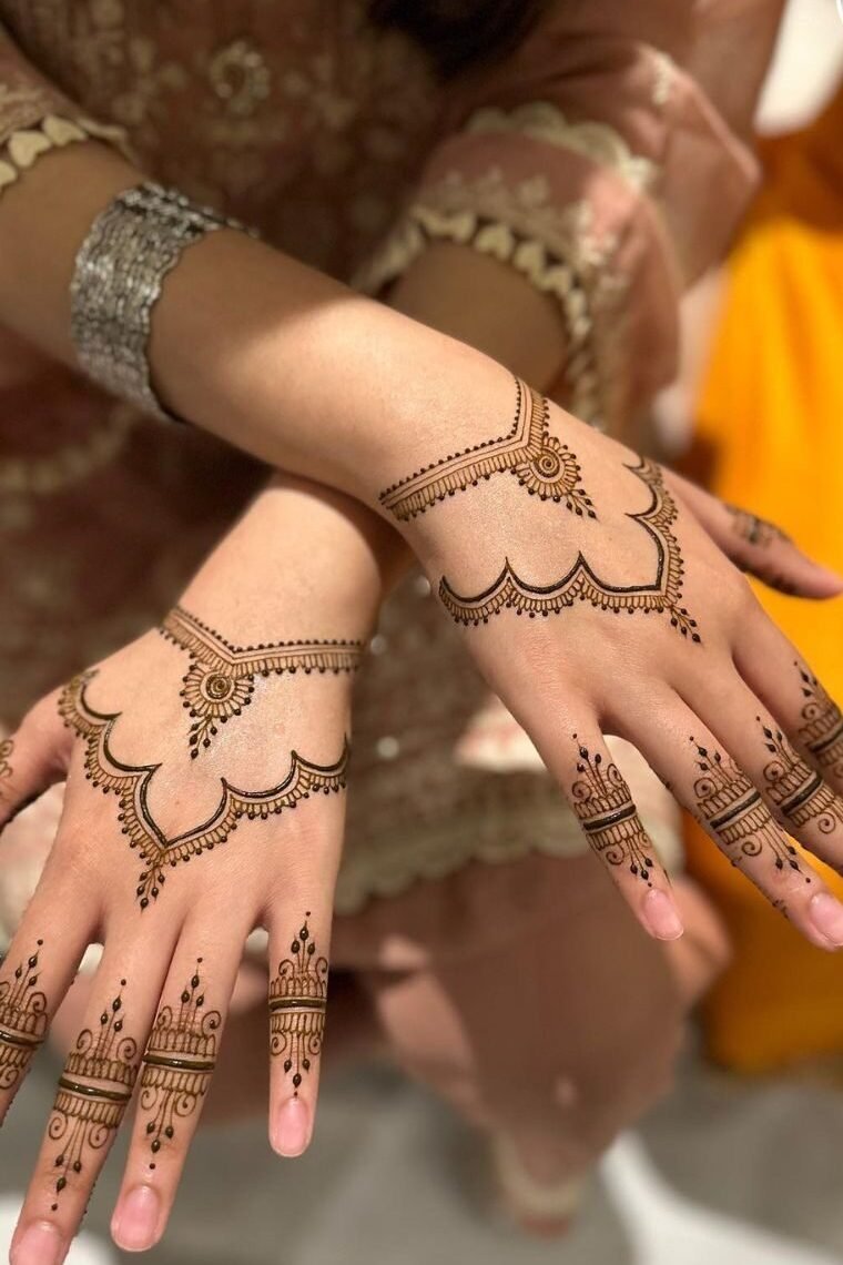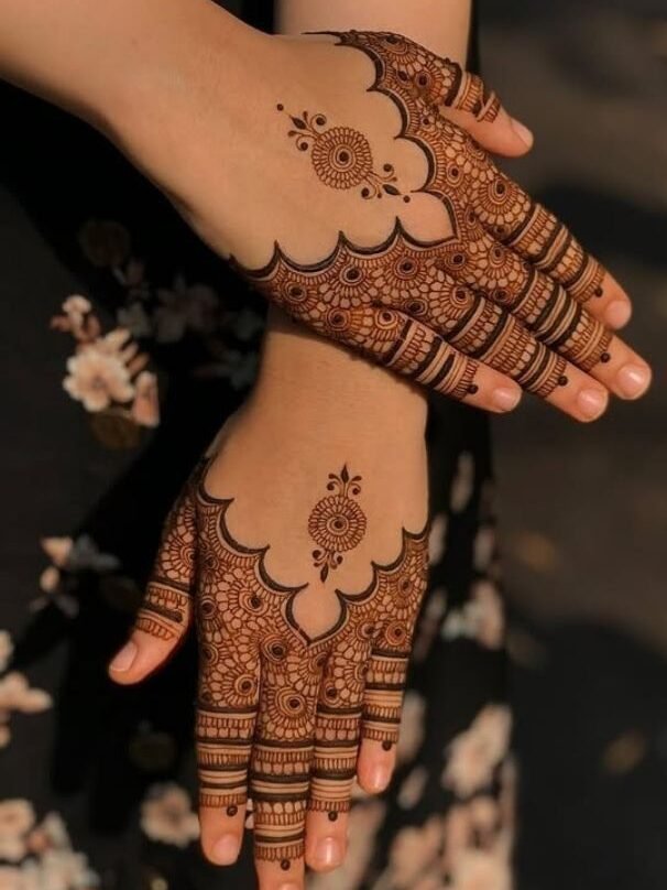 This henna design features a beautiful balance of traditional patterns and fine detailing, with circular motifs and flowing lines that create a graceful and timeless look. The neat strokes and symmetrical elements enhance the natural beauty of the hand from every angle, while the rich henna colour and clean finishing give the design a bold yet elegant appearance. The detailing reflects patience, precision, and artistic skill, making this style perfect for bridal events, engagements, and festive occasions, adding charm and sophistication to every special moment.